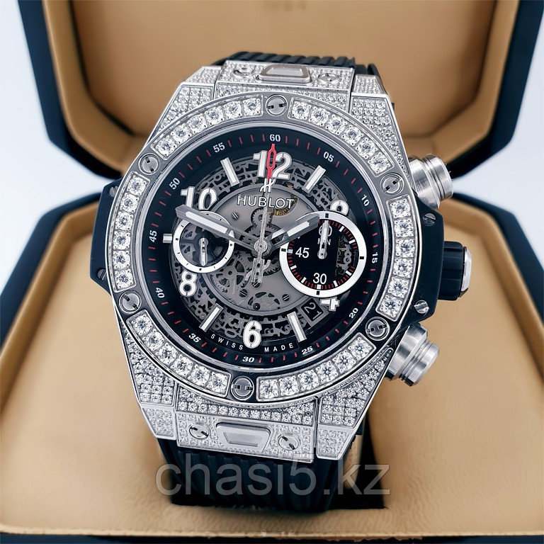 Мужские наручные часы Hublot Big Bang Unico - Дубликат (19523) (Хублот), серебристый стальной корпус, черный каучуковый ремешок. Застежка клипса-автомат. Форма корпуса круглая. Модные часы, механика с автоподзаводом и хронографом