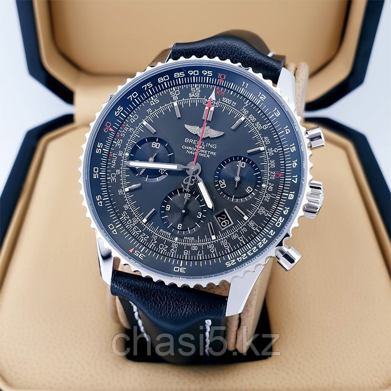Мужские наручные часы Breitling Montbrillant Datora - Дубликат (19763) (Брайтлинг), серебристый стальной корпус, черный кожаный ремешок. Застежка клипса. Форма корпуса круглая. Спортивные часы, механика с автоподзаводом и хронографом