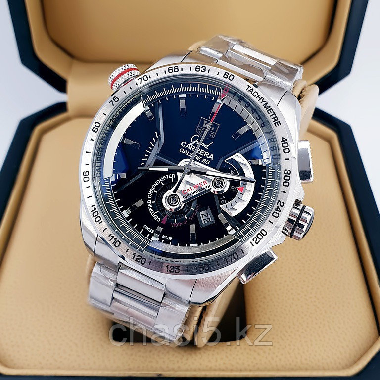 Мужские наручные часы Tag Heuer Calibre 36 (00629) (Таг Хоер), серебристый корпус, серебристый стальной браслет. Застежка клипса. Форма корпуса круглая. Спортивные часы, кварцевые с хронографом