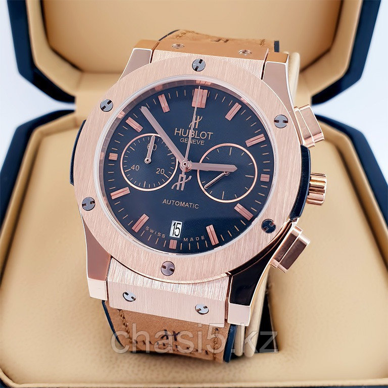 Мужские наручные часы HUBLOT Classic Fusion Chronograph (23505) (Хублот), бронза стальной корпус, коричневый кожаный ремешок. Застежка клипса-автомат. Форма корпуса круглая. Классические часы, кварцевые с хронографом